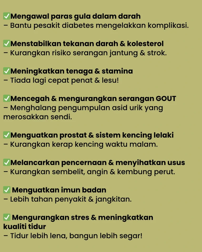 PERTAMA :Teruskan je hidup dengan bacaan gula, darah tinggi & jantung yang makin hari makin naik. Terus makan ubat kimia — badan makin lemah, risiko buah pinggang rosak. Kalau dah kena strok, dah terlantar — baru nak menyesal, dah terlambat!